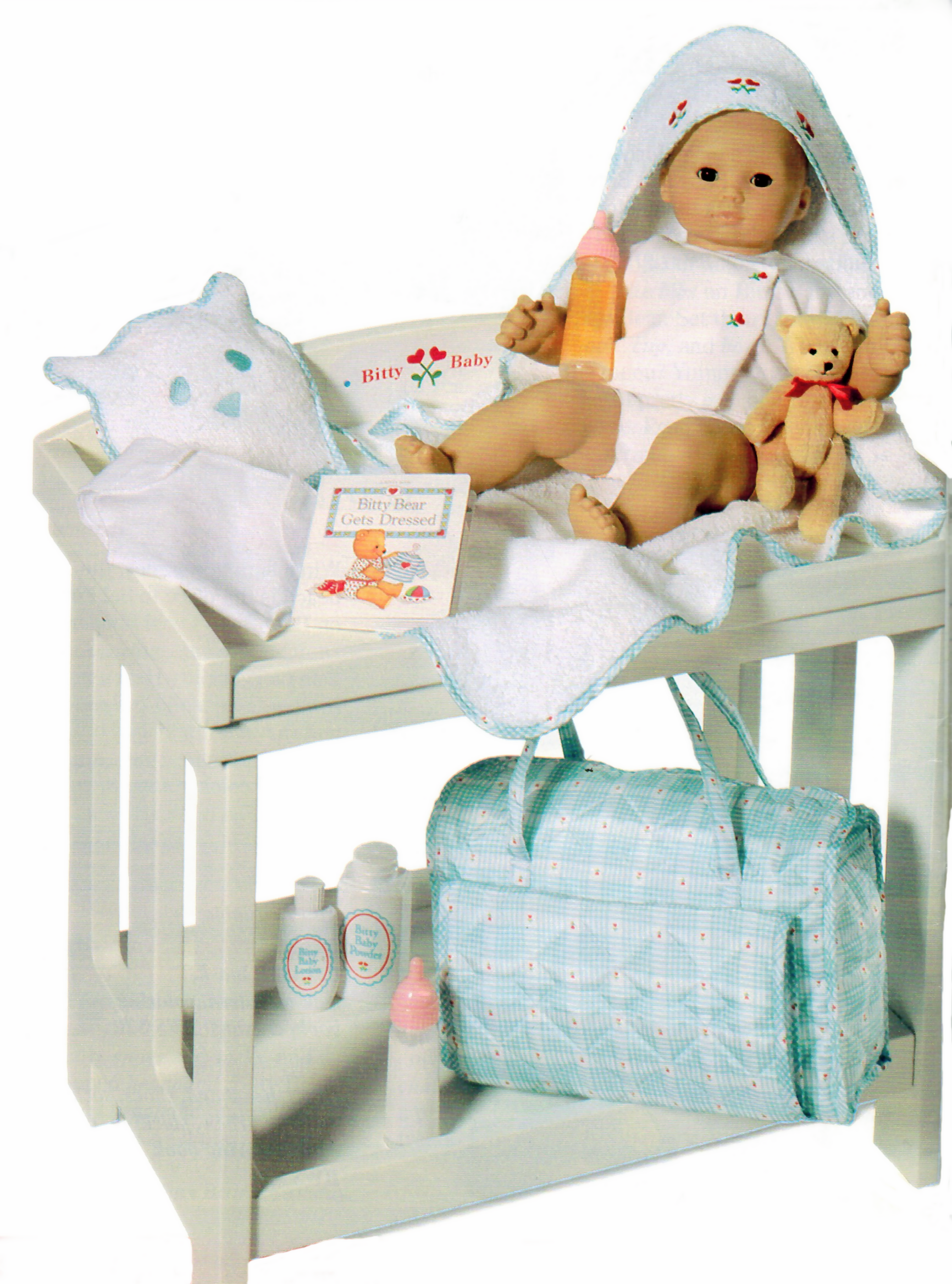 It has a rod for hanging clothes under the top shelf. Bitty baby changing table set. I have limited choices of pads left. Bedroom furniture beds bedroom sets headboards bed frames dressers & chests nightstands armoires & wardrobes mattresses kids beds. Forstart baby changing table with wheels. Something both you and your baby will appreciate! .check out more of our bitty baby videos: Find changing tables at wayfair. This baby doll changing table is exactly like mother and father's baby changing baby doll table, and it olivia's little word baby changing table. Convo me and i will send you a photo of the choices. This baby doll changing table has space for all of bitty baby's items! Some fabric items, may have little stains. 2 ag bitty baby outfits, one teal & one white with flowers 1 ag bitty baby changing table 1 matching ag bitty diaper bag with play ag bb lotion and ag bb powder, 1 extra bb diaper included.